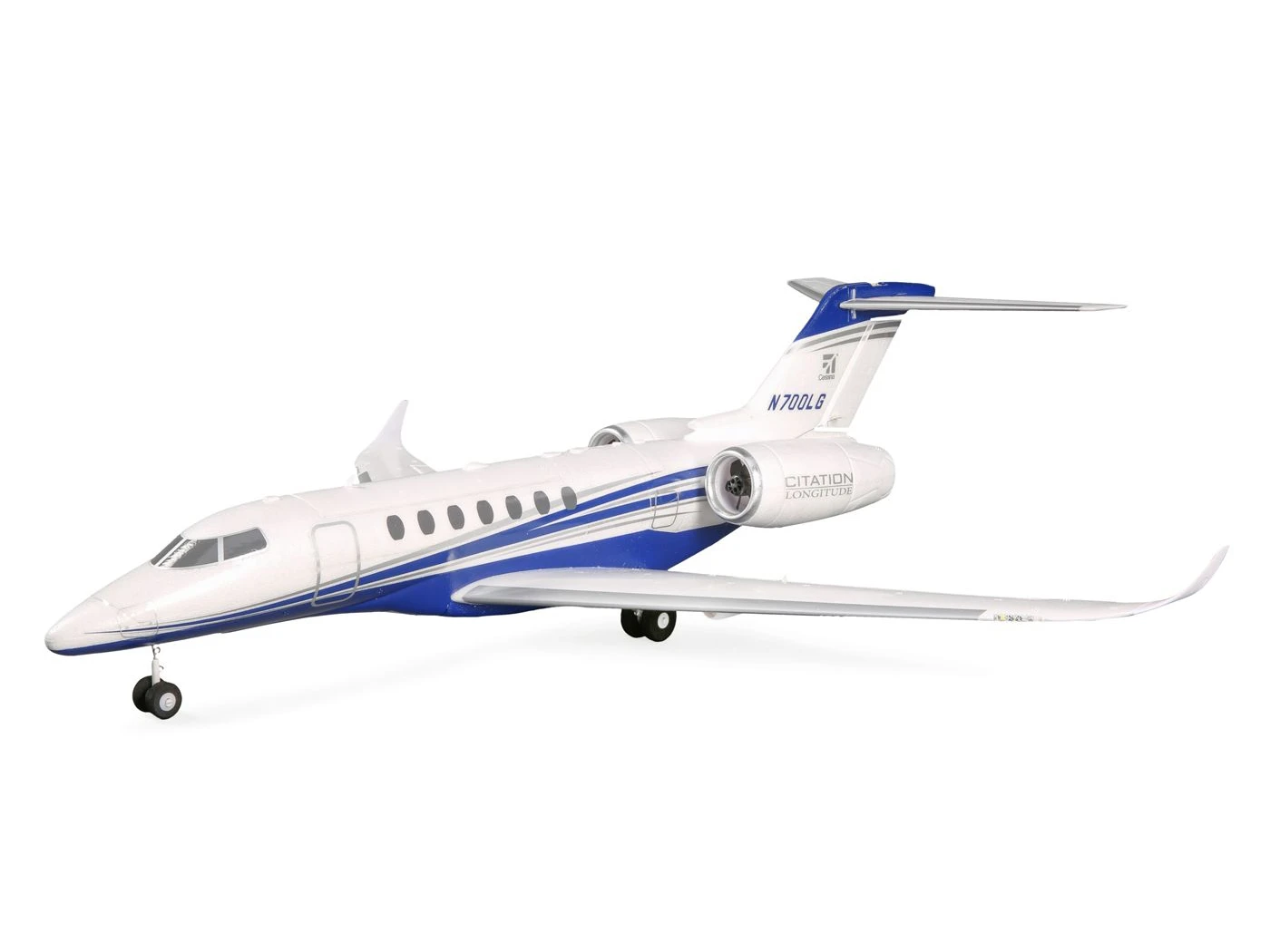 Designed to redefine the super-midsize private jet segment, the Cessna Citation Longitude is expected to revolutionise business travel by offering more range (up to 3500 nautical miles) while carrying greater payloads at higher cruise speeds (up to 550+ MPH). The E-flite® UMX™ (Ultra Micro eXtreme) Citation Longitude is an officially-licensed scale replica of the icon in the making that redefines performance for ultra micro class EDF jets by being the most powerful model in its class yet. With 3S-compatible 30mm EDF power systems, a scale outline and trim scheme, plus functional features including a full-flying stab and LED lights along with exclusive AS3X® and optional-use SAFE® Select technologies, it offers a unique and exciting twin EDF experience – in a size that makes it possible to fly a jet in more places and smaller spaces including at soccer fields, football fields and large parks!