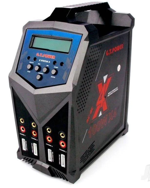 The GT Power X4 Multi-Chemistry professional charger / discharger offers a simple and safe solution to battery management. With four outputs, up to four batteries can be independently charged at the same time, using completely separate charge or discharge routines. With a choice of mains power or 11-18V DC input, the X4 is ideal for use at home or at the field. The backlit LCD screen makes it simple to select all of your charge parameters while also monitoring your battery’s status in any light. Compatible with today’s latest cell technologies, the X4 is the serious choice for charging LiPo, LiHV, LiIon, LiFe, NiMH, NiCd and Pb batteries